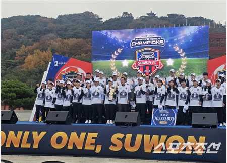 包括水原市市长、水原fc女足会长在内的政府人士以及现场500名球迷一起参加了这场盛典,在盛典前,特别安排了花车游行,水原fc女足的姑娘们在花车上过街,引来球迷们的欢呼。在现场,水原市市长李在俊亲手向冠军球队颁发了联赛冠军奖杯,让姑娘们在家乡再次品尝到了夺冠的喜悦,并给予球队7000万韩元的特殊奖励!
