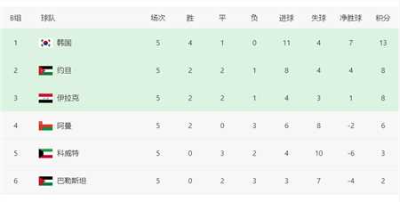 前面5轮小组赛,韩国队4胜1平,未尝败绩,积13分,超出该小组第二名约旦5分,领跑该小组的积分榜。为了进一步巩固自己在该小组的领先地位,韩国队此番对阵实力一般的巴勒斯坦,预计也不会掉以轻心。