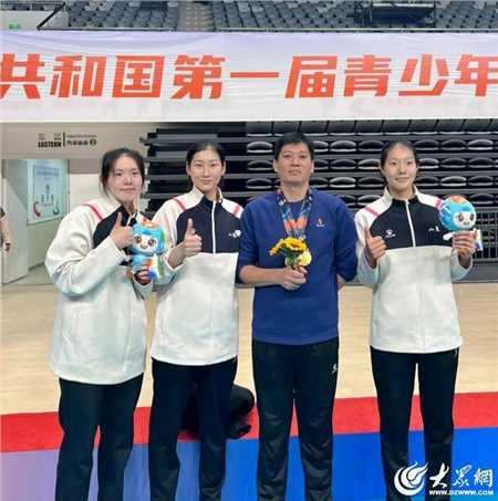 潍坊市体育运动学校女排教练郝政伟(右二)和李美君(左一)、郭湘玲(右一)