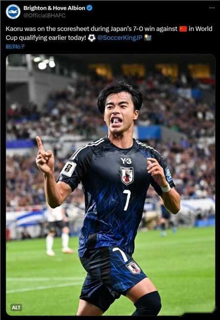 赛后,三笘薰所在俱乐部布莱顿发文:在今天早些时候的世界杯预选赛中,日本队7-0战胜中国队,三笘薰在本场比赛完成进球!